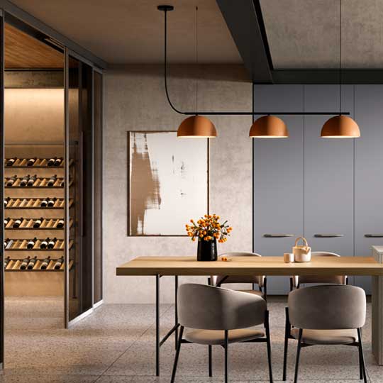 Un design innovativo in cui praticità ed estetica si fondono esaltandosi reciprocamente: mix di finiture naturali incontrano materiali e accessori di ultima generazione.
